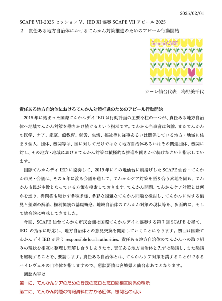 2015年に発足した国際てんかんデイIED第11回に協奏して、正式には2019年に仙台の地で発足したSCAPE仙台てんかん市民会議第7回2025年では、責任ある地方自治体への働きかけをアピールとしました。今回は始めて県政と懇話するに至りました。地方自治体での地域の本格的なてんかんケアのあり方を創り上げていきます。