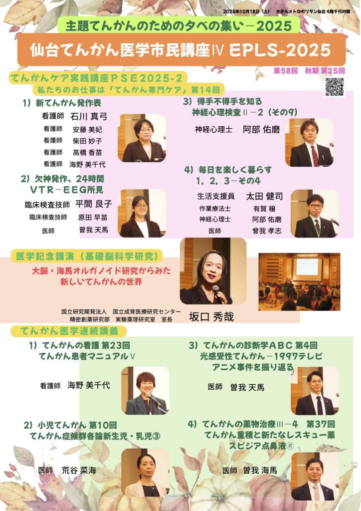 第一部 は、仙台てんかん医学市民講座Ⅳ EPLS-2025 秋期第25回(第58回)で、今回の目玉は医学記念講演(基礎脳科学研究)に、国立成育医療研究センター 精密創薬研究部 実験薬理研究室 室長の坂口秀哉先生に貴重なご講演を頂戴できました。