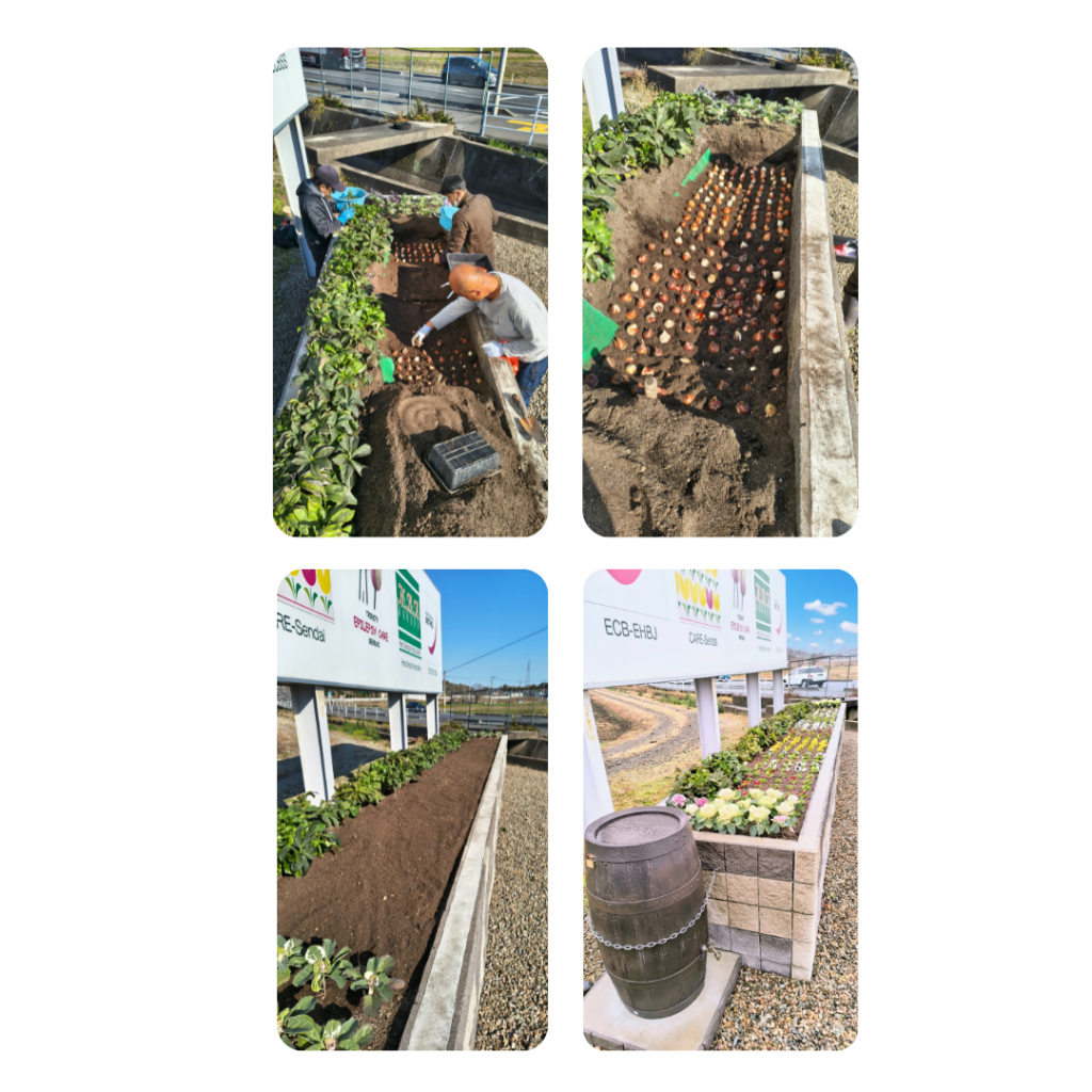 レイアウトが決まれば、植え替え作業のスタートです。12月は、チューリップ、ビオラ、パンジーです。植え替え作業中も利用者さん同士で「この方がバランスよく見えるんじゃないか?こっちの方が見てくれてる人も喜んでくれるんじゃないか?」と真剣に話し合う姿が見られ、皆が助け合い協力して、花々が生き生きと育つ花壇を作り上げています。定期的にお花の手入れや水遣りも、欠かさずに行っています。